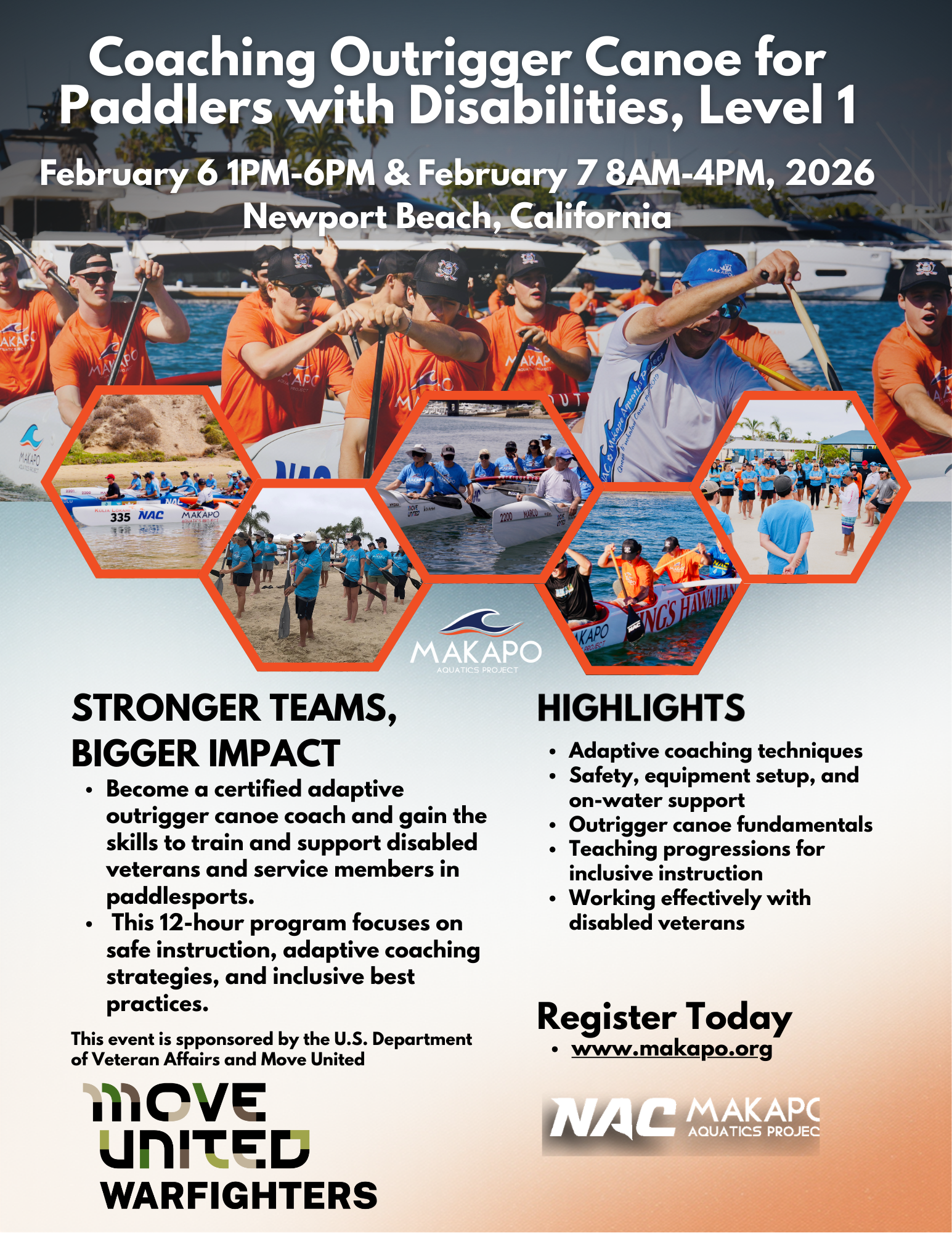 Coaches across the paddling community play a powerful role in helping Veterans rediscover movement, confidence, and connection. If you’re interested in supporting disabled Veterans in your current club—or launching a new adaptive program—this immersive, multi-day learning experience is built for you. This training spans 12 hours total and blends virtual connection, hands-on learning, and real on-water coaching with disabled Veterans. You’ll leave with the skills, insight, and comfort you need to create meaningful paddling opportunities that reflect the heart of our community. And the best part? There is no cost to participate.