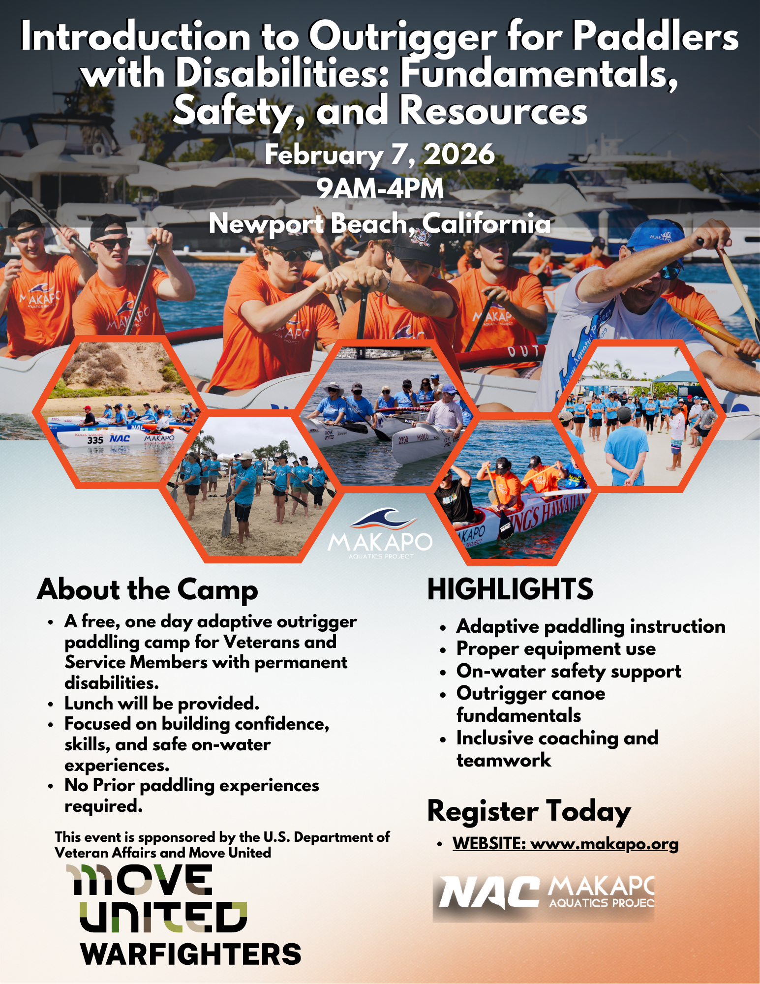 Discover Outrigger Paddling: A Day on the Water for Veterans with Disabilities Lunch included • No cost to participate If you’ve been looking for a fresh way to move, connect, and get out on the water, we’d love to welcome you to a special introductory paddling experience created just for Veterans with disabilities. Outrigger paddling has a way of reconnecting people with their strength and rhythm—while surrounding them with a supportive team that feels like family. This one-day clinic is held alongside our coach training weekend, giving you a chance to paddle with instructors who are passionate about creating meaningful, empowering experiences for Veterans. Whether you’re trying this sport for the first time or returning to the water after some time away, you’ll be met with encouragement, skillful guidance, and a community that’s excited to paddle with you.