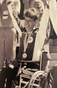 In 1984, Sharon Rahn Hedrick became the first wheelchair athlete to win an Olympic medal. While 90,000 spectators looked on in the L.A. Coliseum, Sharon won the Gold Medal in an 800 Meter exhibition event for women wheelchair athletes during the XXIII Olympiad. A few years prior to this historic event, Sharon was well on her way to an illustrious career in both wheelchair racing and basketball. During thirteen years in track competition, she was undefeated in every national and international race that she entered, setting fifty national and world records in the process. She held the fastest women’s times for every track event she entered during this time span.